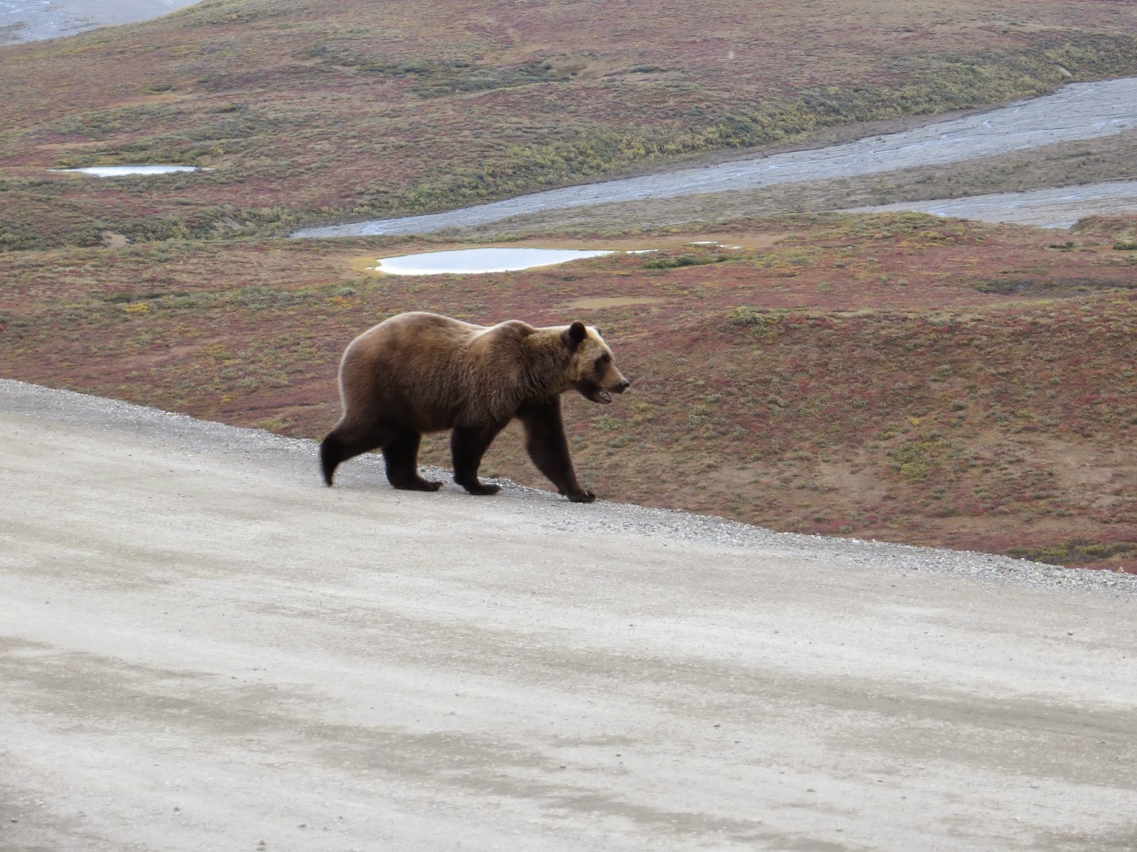 Up to this point, we had yet to see a grizzly bear during any of our journeys. As we ate a snack, Joy disappointingly stated that it looked as though we were going to be in the 5% group, referring to the fact that 95% of Denali visitors get to see a grizzly during their visit. Just then, two girls hurried down the hill we had just hiked and quickly jumped unto the bus, their faces flushed. As they entered, they announced, "There was a bear up there!" Apparently, someone had shared the same information with the group of photographers because we saw them run up the hill, cameras in hand, in the direction the girl had just come.